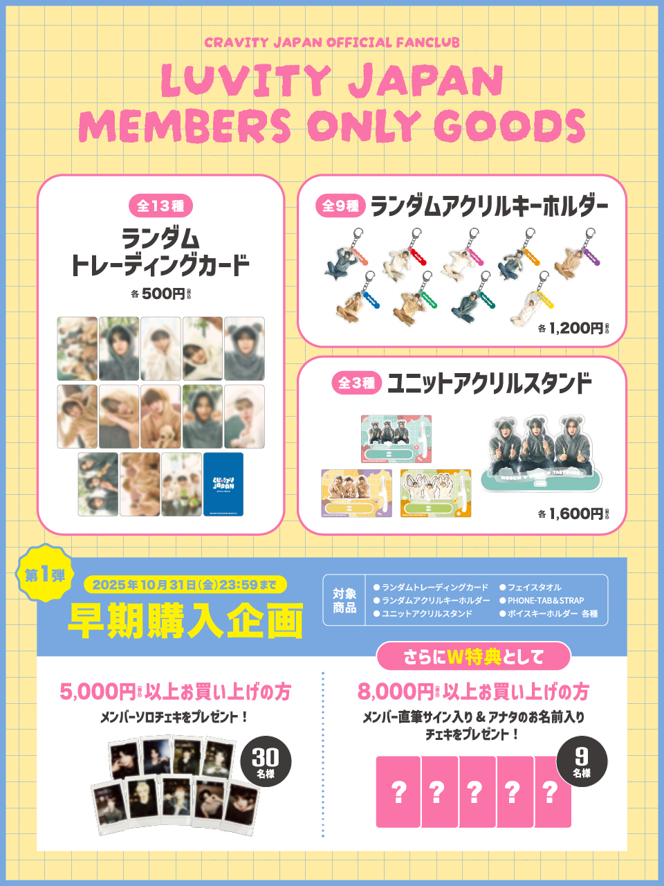 2025年10月5日(日)12:00よりアーティストONLINE SHOP「A!SMART(アスマート)」にてLUVITY JAPAN会員限定グッズが新しく登場します!!第1弾として、「ランダムトレーディングカード(全13種)」「ランダムアクリルキーホルダー(全9種)」「ユニットアクリルスタンド(全3種)」が10月5日(日)12:00より販売。